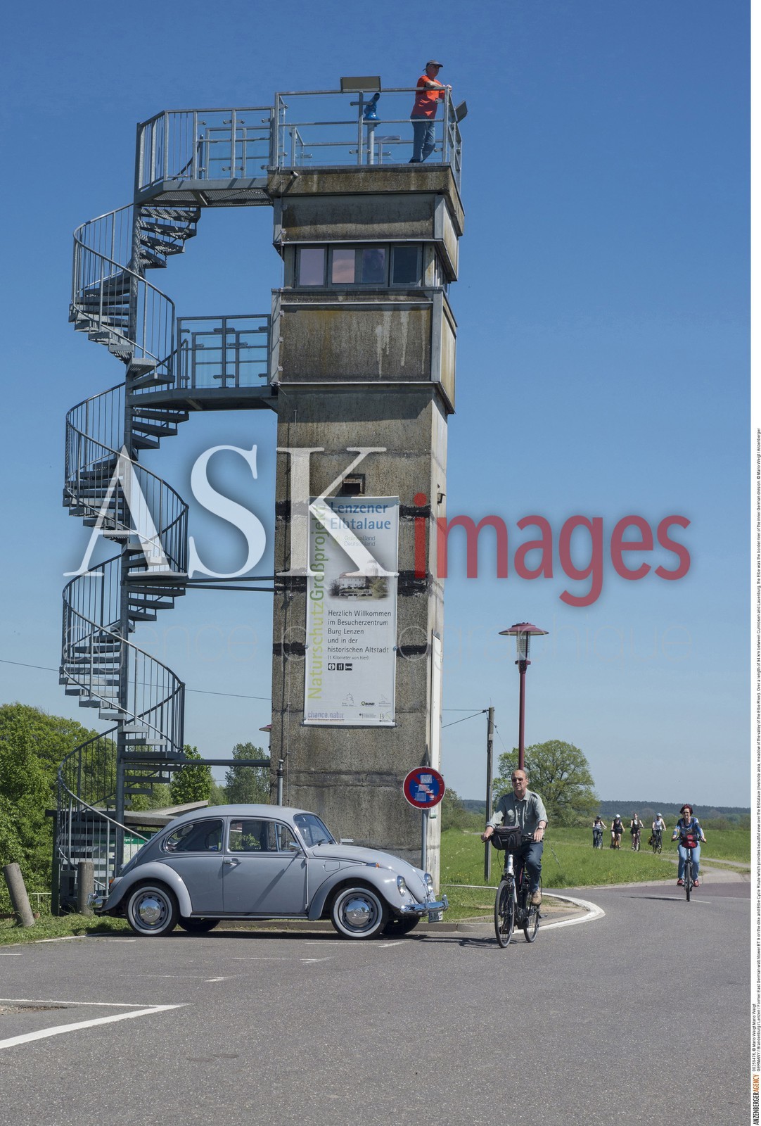 DescriptionGERMANY / Brandenburg / Lenzen / Former East German watchtower BT 9 on the dike and Elbe Cycle Route which provides beautiful view over the Elbtalaue (riverside area, meadow of the valley of the Elbe River). Over a length of 94 km between Cumlosen and Lauenburg, the Elbe was the border river of the inner German division. ..© Mario Weigt / Anzenberger
