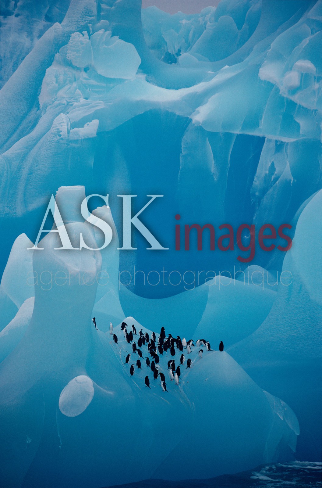 | Description | Chinstrap Penguins rest on a blue iceberg of ancient ice sculpted by the sea water, Antarctica |