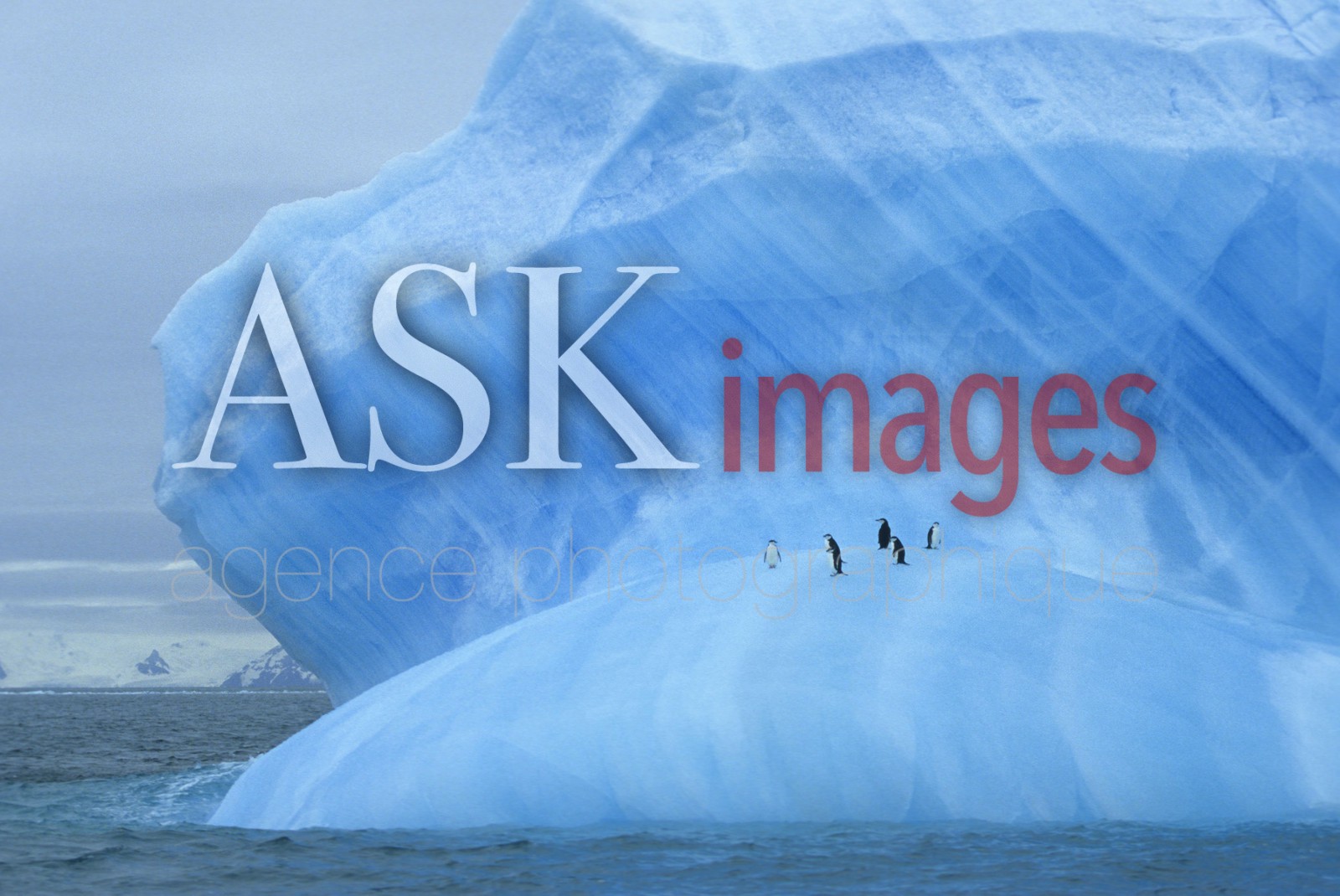 ANTARCTICA, CHINSTRAP PENGUINS RESTING ON BLUE ICEBERG NEAR ELEPHANT ISLAND