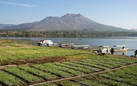 Onions grown on the irrigated shores of Lake Batur with the volcano Gunung Batur in the background with tourist boats tied up on lakeside Kedisan Penelokan Bali .