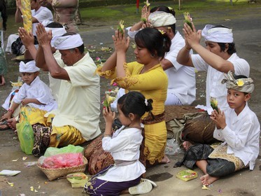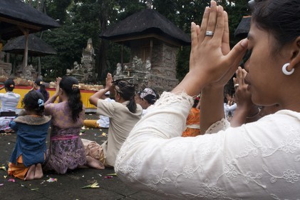 A BALINESE family and friends prays at PURA TIRTA EMPUL a Hindu Temple complex and cold springs - TAMPAKSIRING, BALI, INDONESIA. Several people pray and leave offerings in the Holy Monkey Forest during the celebration of Galungan.