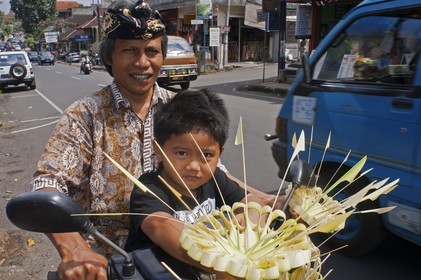 Father with his son in a motorbyke. Hindu Rituals and celebrations in the near Kuta temple, Bali, Galungan celebrations Bali Indonesia
