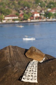 A prayer on a rock overlooking the small fishing village of Amed, with Gunung Agung mountain background (3142m). East Bali.