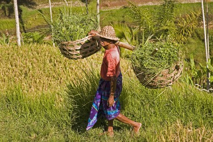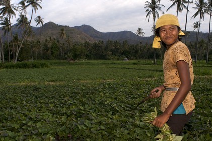 An girl collects harvest in a field near the fishing village of Amed East Bali culture. Amed is a long coastal strip of fishing villages in East Bali. Amed refers to a long stretch of coast running from the village of Cucik about 14 km eastwards incorporating the seven villages