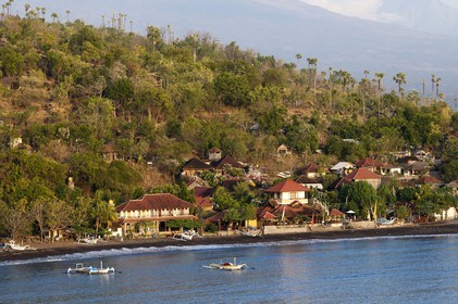 The small village of Amed fisherman with views of Mount Gunung Agung background (3142m). East Bali. Amed is a long coastal strip of fishing villages in East Bali.