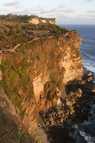 Tourists along the cliffs next to the Ulu Watu temple Pura Luhur. Bali. Uluwatu Temple is a Hindu temple set on the cliff bank in south part of Bali Peninsula. It is one of Sad Kahyangan Temple in Bali (six big groups of Bali Temples)