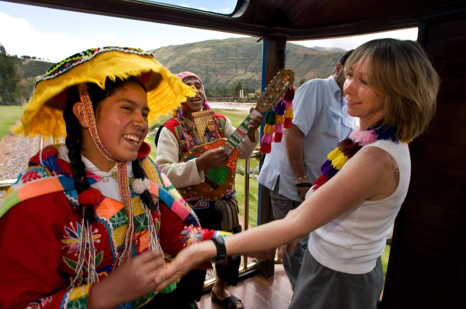 | Description | Andean Explorer, luxury train from Cusco to Puno, Train inside, Musicians and dancers in traditional costumes ride on beautify the Andean Explorer train Orient Express which runs between Cuzco and Puno. |