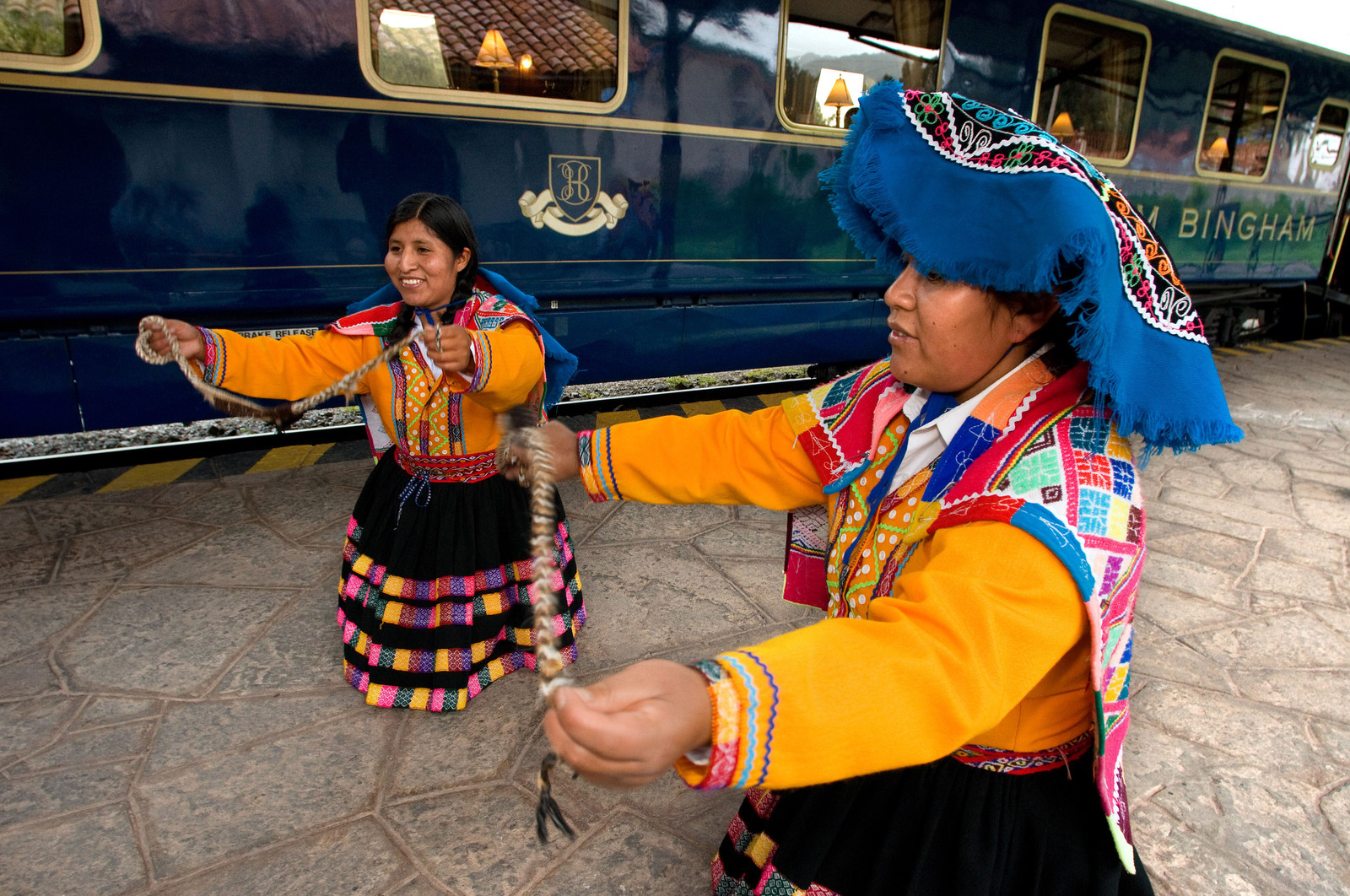 | Description | Peru Luxury train from Cuzco to Machu Picchu, Orient Express, Belmond, Musicians and dancers in traditional costumes in the Hiram Bingham Orient Express which runs between Cuzco and Machu Picchu. |