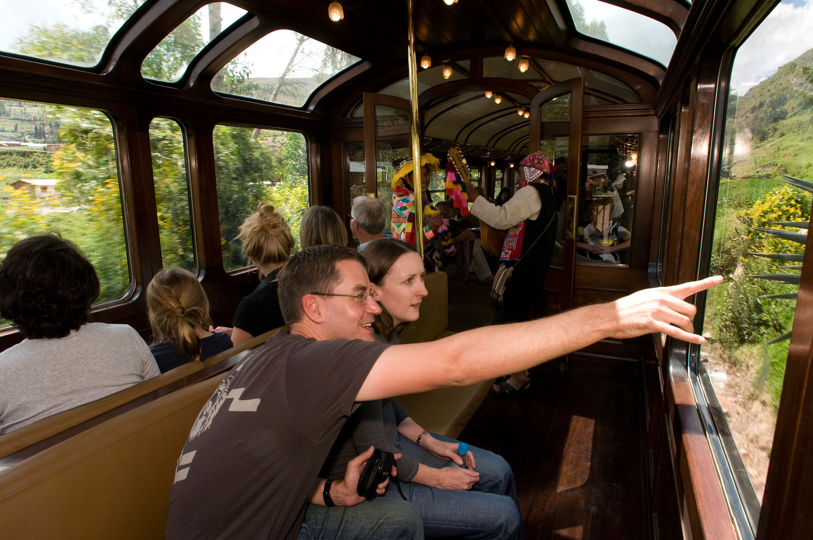 | Description | Andean Explorer, luxury train from Cusco to Puno, Observation car entertained by musicians and dancers in traditional costumes at the Andean Explorer train Orient Express which runs between Cuzco and Puno. |