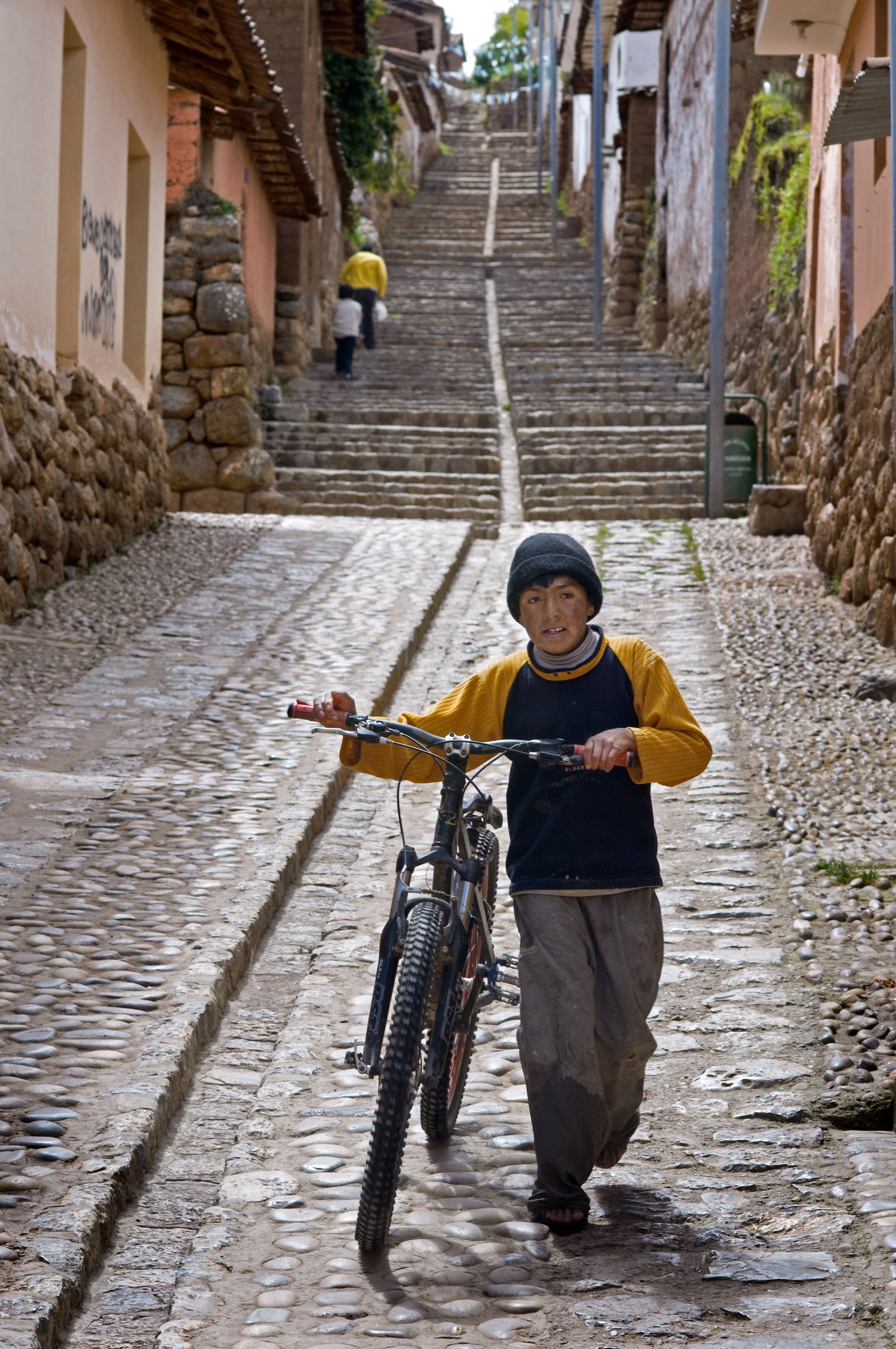 | Description | A child on a bicycle in one of the steep streets of the small village of Chinchero in the Sacred Valley near Cuzco, Chinchero is a small Andean Indian village located high up on the windswept plains of Anta at 3762m about 30km from Cusco. |