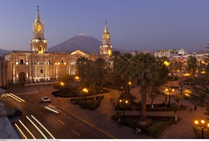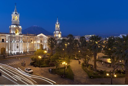 PERU / Arequipa / Historic town / Plaza de Armas / Basilica Cathedral of Arequipa with volcano Misti in background at dusk..© Oliver Bolch / Anzenberger Perou *** Peru