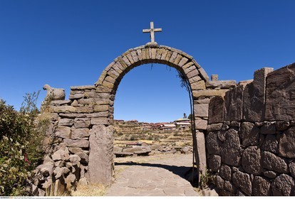 PERU / Puno / Lake Titicaca / Taquile Island / View through stone arch ..© Oliver Bolch / Anzenberger Perou *** Peru