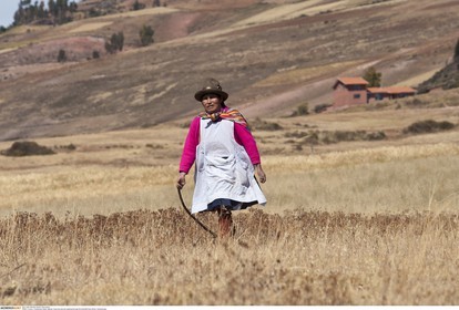 PERU / Cusco / Urubamba Valley / Maras / Quechua woman walking through the fields..© Oliver Bolch / Anzenberger Perou *** Peru