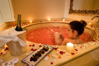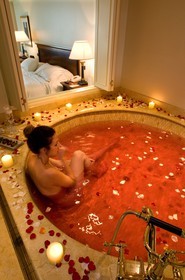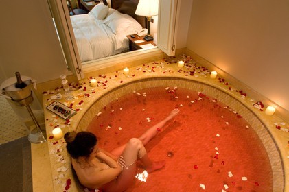 • Inside one of the rooms at the Miraflores Park Hotel by Orient Express Belmond, Lima, Peru, It has a fabulous aphrodisiac bath in a circular roman tub with rose petals and some magic dust, which make you enjoy sensuality of the moment, together, champagne and strawberries dipped in chocolate