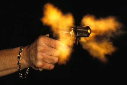 • Wallingford, Brass casing, shell, is ejected from the chamber of a semi-automatic pistol, handgun, firearm by blow back of compressed gas being released by gunpowder after the trigger is pulled during shooting at a gun range. © Peter Hvizdak / The Image Works