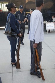 • New York, New York, USA; Supporters of the 'gun freedom', the right to keep and bear arms, during a demonstration in New York against the laws on gun control. ©Les Stone / The Image Works
