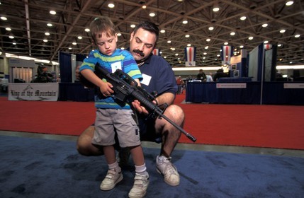 • Dallas, Texas, USA; A boy checks out a gun during a N ational Rifle Association Convention in Dallas, Texas. ©Les Stone / The Image Works