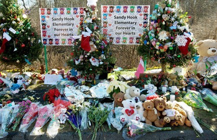 • Newtown, CT: December 19, 2012. Candles, flowers, stuffed toys and Christmas trees are part of the makeshift memorial which honors the victims of the Sandy Hook Elementary School massacre on December 19, 2012 in Newtown, Connecticut. Last week the gunman, Adam Lanza, opened fired inside the school, killing 20 students and 6 adults, before turning the gun on himself. It is believed that Lanza suffered from mental illness and used his mother's weapons to carry out the shootings..