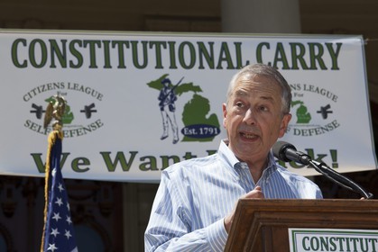 • Lansing, Michigan - Larry Pratt, executive director of Gun Owners of America, speaks at a rally at the state capitol opposing a bill to repeal Michigan's "stand your ground" law. Michigan's law is similar to the Florida legislation publicized by the Trayvon Martin shooting; it allows gun owners to shoot to kill if they feel endangered, rather than first trying to retreat..© Jim West / The Image Works