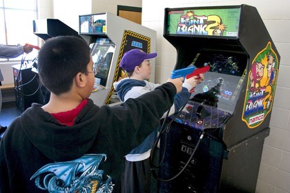 • St Paul, Minnesota: Kids age 11 shooting Point Blank video game with red and blue replica 45 caliber plastic pistols. Caucasian white Asian American ©Skjold Photographs / The Image Works