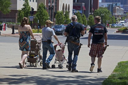 • Lansing, Michigan - Gun rights advocates, many of them carrying firearms, leave the state capitol after a rally opposing a bill to repeal the Michigan "stand your ground" law. Michigan's law is similar to the Florida legislation publicized by the Trayvon Martin shooting; it allows gun owners to shoot to kill if they feel endangered, rather than first trying to retreat..© Jim West / The Image Works
