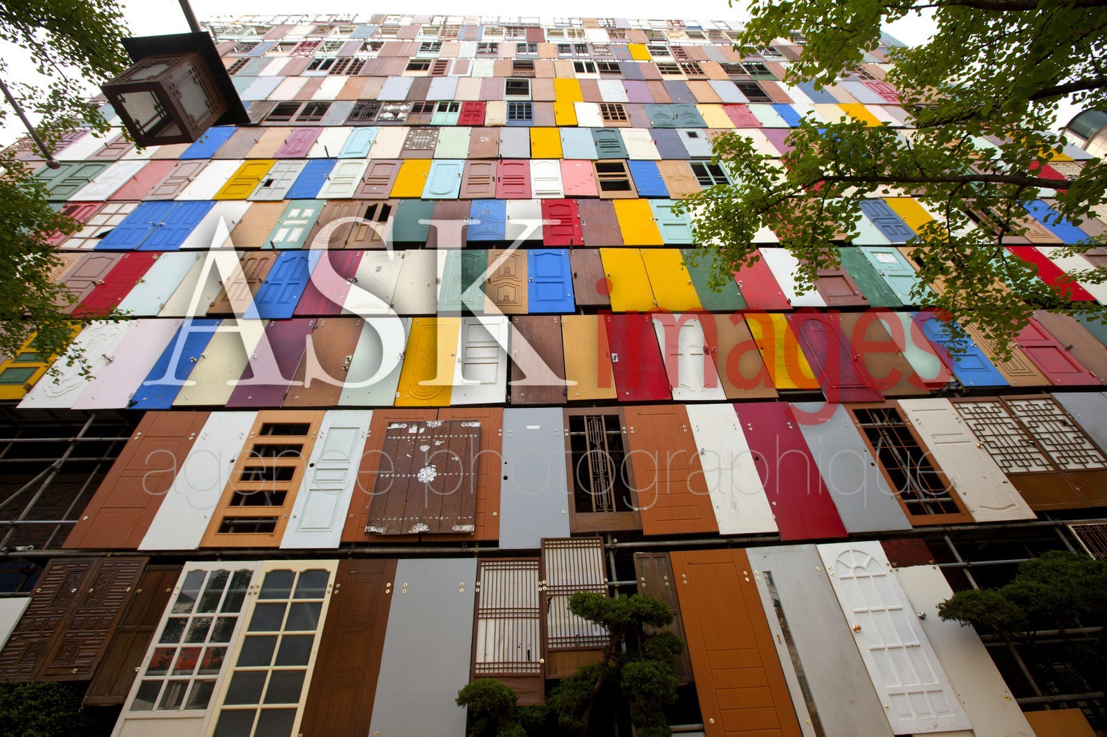 SEOUL : COREE DU SUD *** Local Caption *** un damier de vieilles portes et fenetres en bois fait office d'écran aux travaux de rénovation d'un immeuble