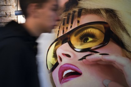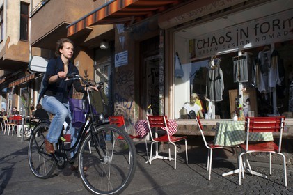 Woman in bicycle in front of Chaos in form shop in Kreuzberg. Falkenstein Street near Oberbaum Bridge, Design Store, Club Scene, Kreuzberg, Berlin.