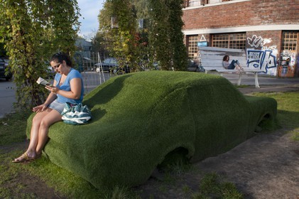 Berlin, Germany, on Garden of slowing fleet Arena Berlin. Oversized benches and cars covered in grass at Arena Berlin. Cultural events in a listed factory building along the former GDR border. Today, this 7,000 sqm venue at the edge of the Spree River is the site for countless concerts, fairs and parties