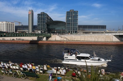 Boat excursion in the Spree river, Berlin. At back Berlin Hauptbahnhof train station. Spree, Landwehrkanal and Havel