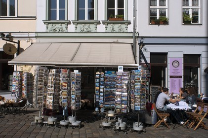Picture souvenirs display of Berlin images. Quite a number of street-sellers and shops, situated mostly around Checkpoint Charlie, offers "reliquia - reliquiorum" of what was once DDR (Deutche Demokratische Republik).