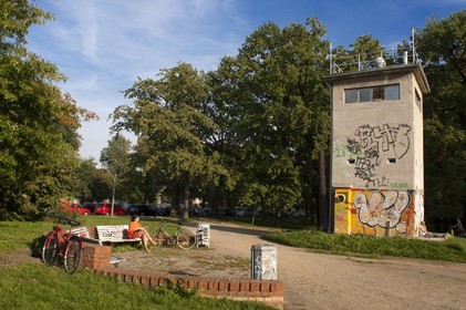 Germany, Berlin. A relaxing afternoon on the lawn of the East side gallery along the Spree. The East Side Gallery is an international memorial for freedom. It is a 1.3 km long section of the Berlin Wall located near the centre of Berlin on Muhlenstrasse in Friedrichshain-Kreuzberg.