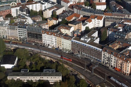 Berlin Panorama from the Fernsehturm with the shadow of the tower, Berlin, Germany. Differents trains.