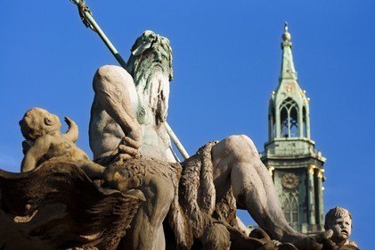 Neptunbrunnen Fountain, Marienkirche Church in the back, Alexanderplatz Square, Berlin-Mitte, Germany, Europe. The Neptune Fountain in Berlin was built in 1891 and was designed by Reinhold Begas.