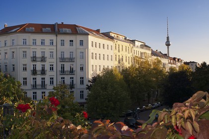 Prenzlauerberg District, building around the former Wasserturm, 1873 brick water tower converted to an apartment. Tower TV. Wasserturm.