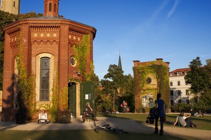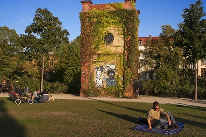 Prenzlauerberg District, garden around the former Wasserturm, 1873 brick water tower converted to an apartment. Wasserturm. Watertower in Berlin (Germany) was build up in 1877 and is the symbol for Prenzlauer Berg.