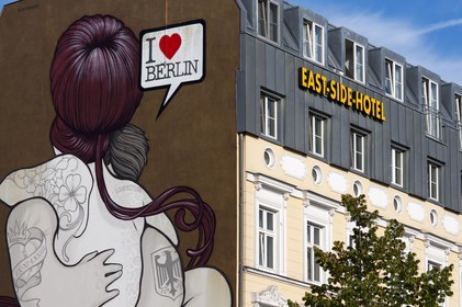 I love Berlin. East Side Hotel in front of East Side Gallery. The East Side Gallery is a 1.3 km-long painted stretch of the former Berlin Wall along the Muhlenstrasse in former East Berlin. It is the largest open-air gallery in the world with over one hundred original mural paintings.