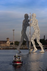 Metallic sculpture called Molecule Man by Jonathan Borofsky in Spree River Berlin. Molecule Man is a series of aluminium sculptures, designed by American artist Jonathan Borofsky