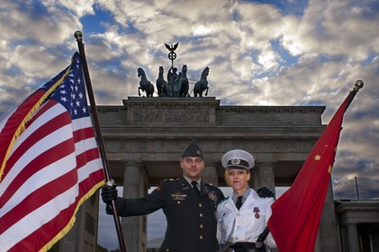 Actors dressed as American and Soviet soldiers pose for photos with tourists in front of the Brandenburg Gate in Berlin, one of the Cold War's most iconic landmarks.
