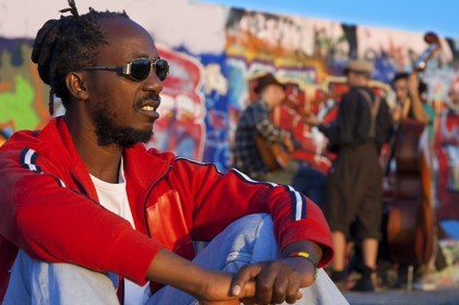 Musicians. Buskers by the Wall in Mauerpark Berlin in evening light Germany. Mauerpark is a public linear park in Berlin's Prenzlauer Berg district.