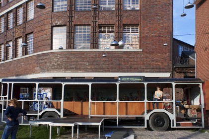 Berlin, Germany, on a old bus in Arena Berlin. Oversized benches and cars covered in grass at Arena Berlin. Cultural events in a listed factory building along the former GDR border. Today, this 7,000 sqm venue at the edge of the Spree River is the site for countless concerts, fairs and parties