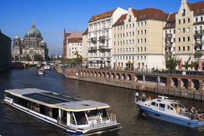 A tourist boat on the Spree river alongside The Nikolaiviertel or St. Nicholas Quarter on a sunny day. Nicholas quarter with the berliner dom or cathedral in the background on a sunny day.