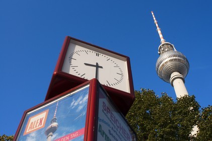 Television tower and world clock at Alexanderplatz in Berlin. Everyone is supposed to remember that Berlin‚ Fernsehturm (TV Tower) is 365m high and is the tallest building in Berlin.