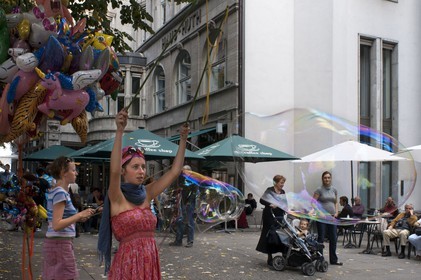 Potsdamerplatz. Haus Huth entrance 1879 in the Daimler Benz new quarter. Squaters doing a soap balloons. Haus Huth, 5 Alte Potsdamer Strasse, was built for the Huth family in 1912, by architects Conrad Heidenreich and Paul Michel.