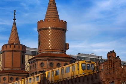 Germany, Berlin, the Oberbaumbrucke bridge that links Kreuzberg and Friedrichshain districts over the Spree river. The Oberbaum Bridge (German: Oberbaumbrucke) is a double-deck bridge crossing Berlin's River Spree, considered one of the city landmarks.