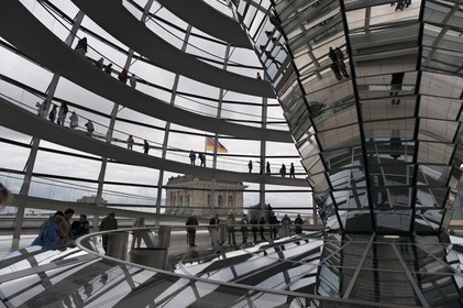 Mirrored cone inside the Reichstag Dome, in the german parliament (Reichstag), Berlin. The current Reichstag dome is an iconic glass dome constructed on top of the rebuilt Reichstag building in Berlin.
