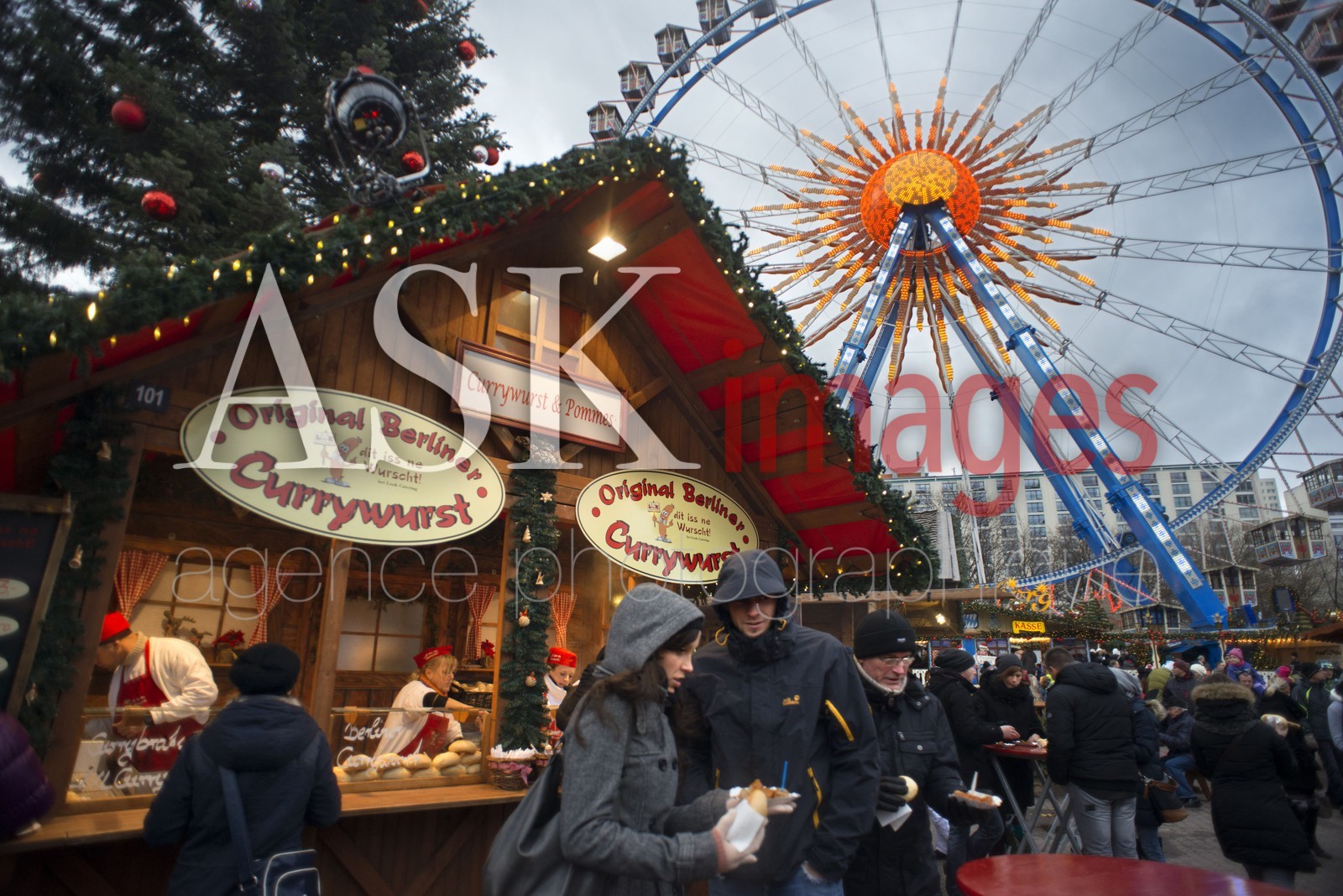 | Description | Ferris wheel and currywurst at the Christmas market in front of the Neptunbrunnen fountain, Alexanderplatz, Berlin. Snack Bar at Alexanderplatz . |