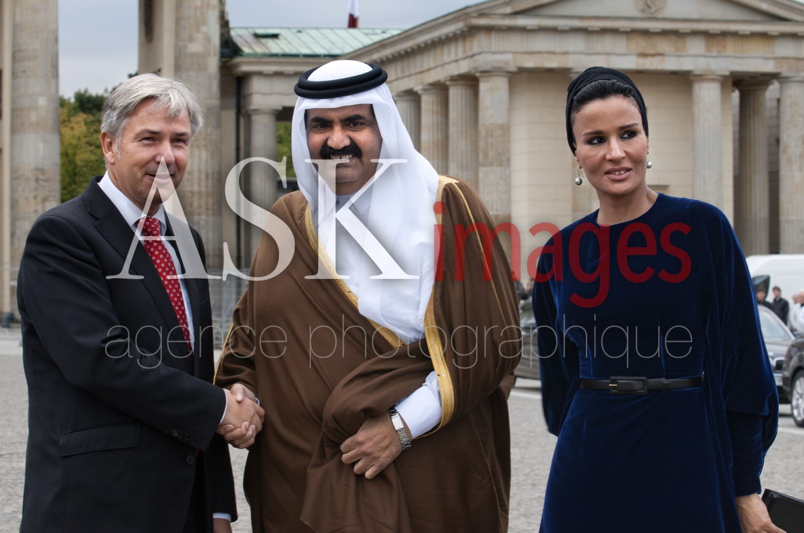 | Description | Berlin Major Klaus Wowereit (C), accompanies the Emir of Qatar, Hamad bin Khalifa Al Thani (L), and his wife Mozah Binti Nasser Al Missned (R), to the landmark Brandenburg Gate in Berlin, Germany. |