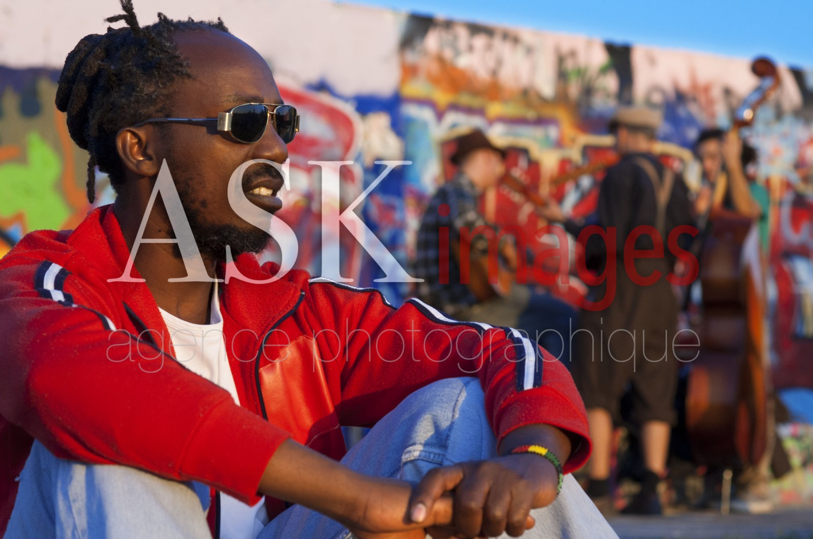| Description | Buskers by the Wall in Mauerpark Berlin in evening light Germany. Mauerpark is a public linear park in Berlin's Prenzlauer Berg district. |