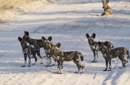Zimbabwe : young wilddogs on the bush roads in the hwange park *** Zimbabwe : jeunes lycaons sur les sentiers du Hwange park