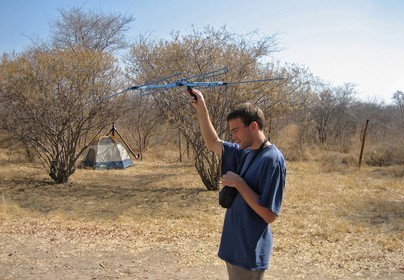 ONG : un participant essayant de se familiariser avec le systeme de localisation des lions portant un collier emetteur *** Volonteer mission : a volonteer during a training to learn how to locate with an aerial a lion wearing a transmitting collar